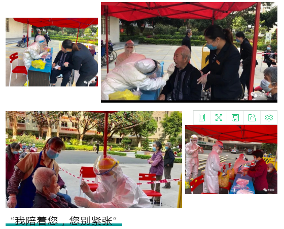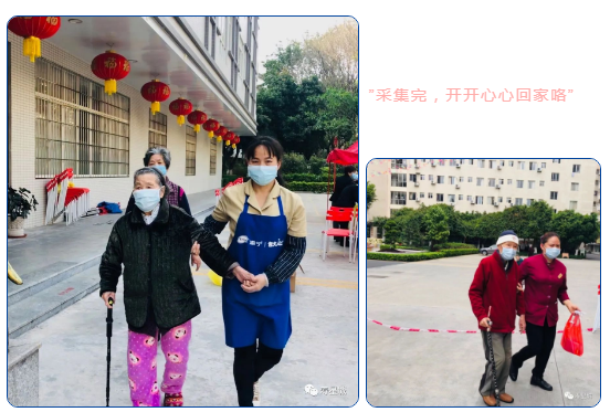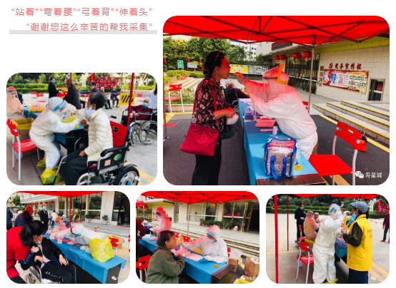 ”啊、啊、啊“,”像我一样把嘴张开“,“不要紧张”这是我在采集现场听到最多的话语,个别长者由于初次接触咽拭子采集,难免会有不安的情绪,但在主管,班长及护工的耐心陪同,细心引导下,叔叔阿姨们有秩序的,开心的完成了采集。