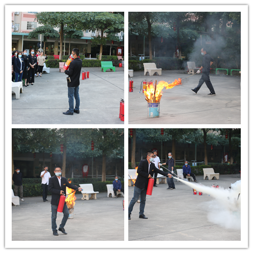 演练结束后,所有演练人员集合,现场指挥清点人数后向总指挥汇报,并一同与观摩人员学习了消防相关知识。最后副总指挥谢总就本次演练达到效果的优缺点进行了总结,总结完后对灭火器的使用方式方法进行了现场实操训练。
