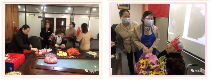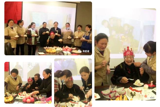 为了让庆生活动顺利进行,工作人员早早为老人梳妆穿戴,并将活动室进行简单的生日会场布置,一首温暖、浓情的生日歌后,寿星和员工一起许愿、吹蜡烛、切蛋糕、合影留念。