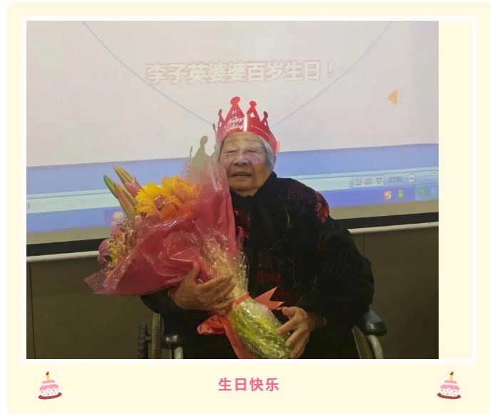左院长、张主管,以及数名护理员围绕在百岁寿星旁边,一同为寿星庆贺百岁生日