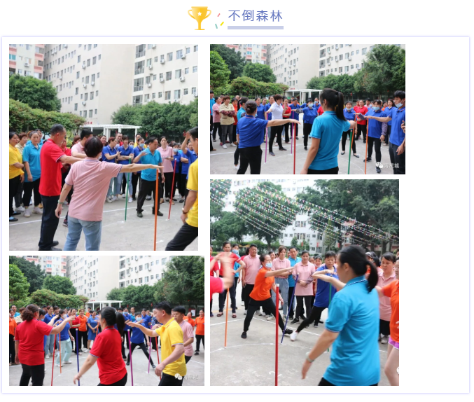 不倒森林对团队之间的默契和协作能力考验较大,一不小心就可能接不到杆子。最终生龙活虎、虎虎生威、颐寿公寓2队分别位列第一第二第三,恭喜以上三队!