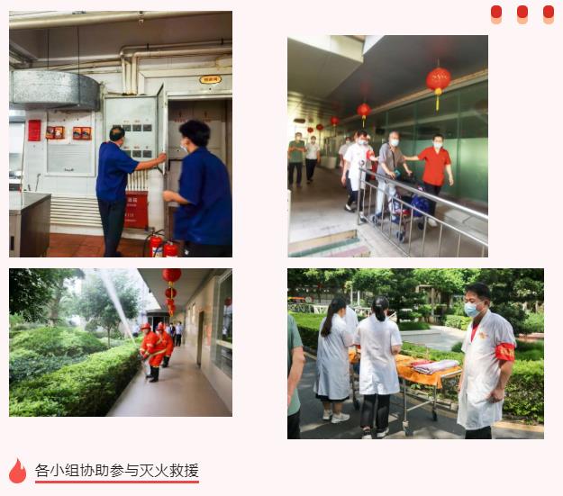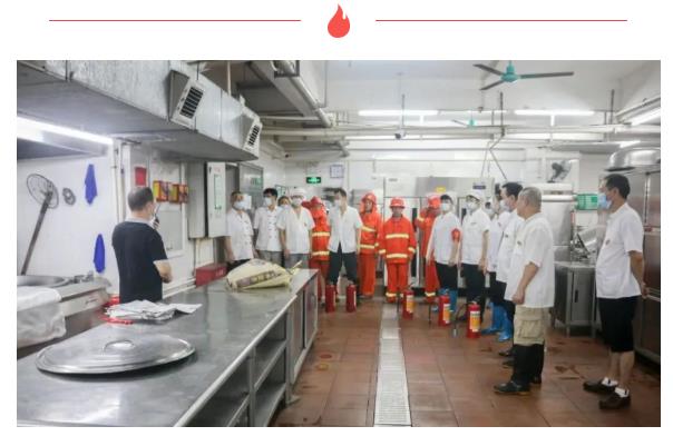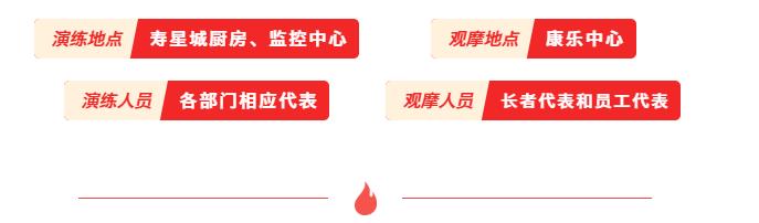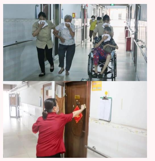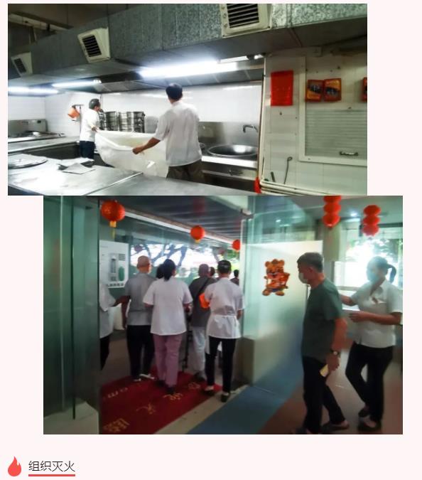 本次演练以寿星城后厨为假设起火点,并由营养部员工、楼层班长,保健医生,护工及其它部门的相关员工组成演练人员,分别设置消防控制室值班人员,厨房灭火行动组,志愿消防队,餐厅疏散引导组,,楼层疏散引导组,物资保障组,医疗救护组,摄影宣教组,现场保护检查组,工程保障组。各组分工明确,井然有序地完成了演练,现在让我们一同回顾当时的演练活动现场的画面。