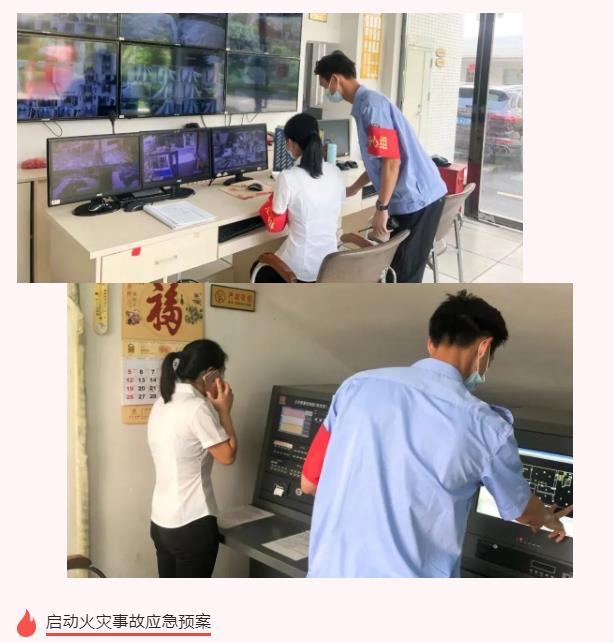 消防控制室报警系统发出报警,值班人员立即安排防火巡查人员赶赴现场确认火情同时通过监控画面实时了解现场情况,并打电话给厨房班长确认情况。现场确认火情后消防控制室值班人员通过广播及时通知,并上报总指挥,总指挥第一时间启动应急预案并命令副总指挥赶赴现场参与救援。