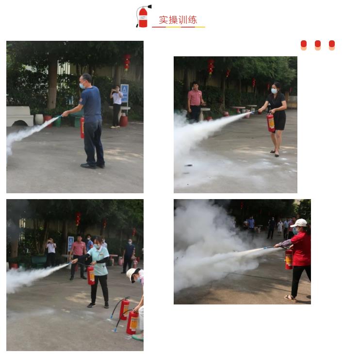 全体人员完成疏散演练后,集中到寿星城铜钱广场进行灭火器的实操训练。