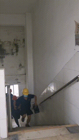 扮演被困人员的志愿者走入电梯后,遇到电梯故障,被困人员当即按下电梯求救警铃,通过五方通话与监控中心对讲,叙述被困情况,请求救援。