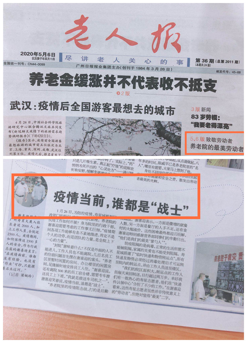 5月6日在《老人报》第36期的“致敬劳动者--养老院的最美劳动者”的专题报道中,刊登了寿星城防控防疫人物事迹,文章标题“疫情当前,谁都是战士”,一起去看看吧~
