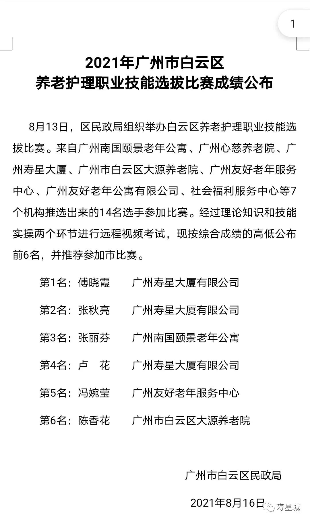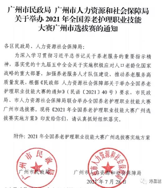 为加强养老服务人才队伍建设,推动养老服务高质量发展,广州市民政局以及广州市人社局依照《民政部 人力资源社会保障部关于举办全国养老护理职业技能大赛的通知(民函〔2021〕40号》的要求,广州市民政局以及广州市人社局联合举办全国养老护理职业技能大赛广州市选拔赛。