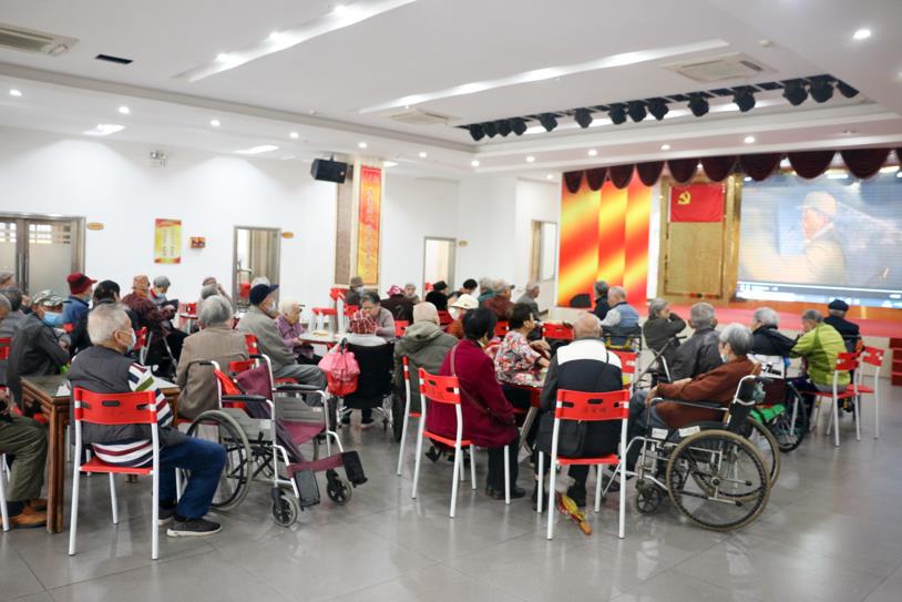 好戏开场,长者们都有序地围坐在椅子上欣赏电影,桌上也摆放了长者们爱吃的零食和水果,供他们在座期间品尝。