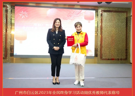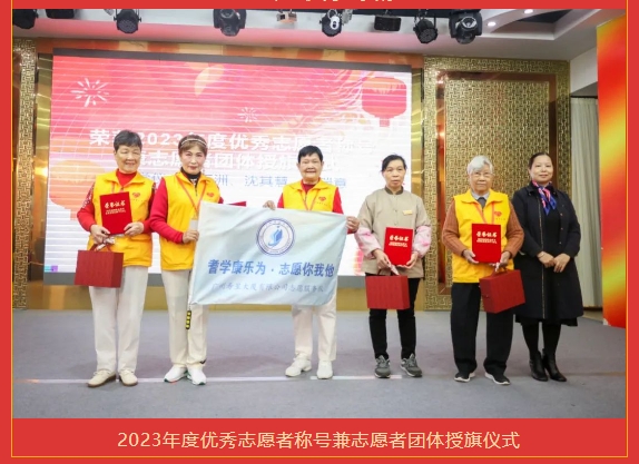 接着是颁奖环节,由广州寿星大厦总经理徐育彩女士颁发广州市白云区2023年全民终身学习活动周优秀教师代表称号奖,常务副总经理谢喜迎先生颁发2023年度文明寿星称号奖,运营总监唐华明女士颁发2023年度优秀学员称号奖,医护部副经理左修英女士颁发2023年度优秀志愿者称号兼志愿者团体授旗仪式。