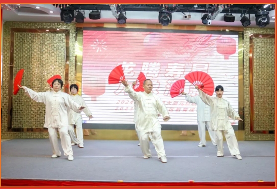 第二模块的第一个节目是太极养生队表演的《太极功夫扇》。表演者们身穿统一的太极拳服装,伴随着悠扬的音乐,缓缓起势。以行云流水般的动作展现出太极功力,将太极文化的独特魅力融入一招一式中。