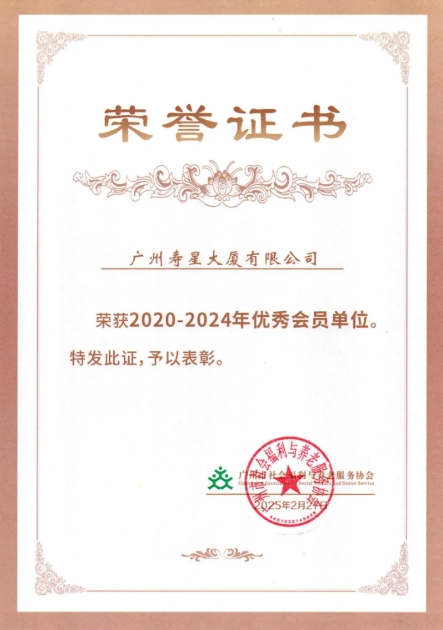 经现场选举,广州寿星大厦凭借卓越的行业贡献和专业养老服务能力,荣获广州市社会福利与养老服务协会 "2020-2024 优秀会员单位" 称号,并成功当选新一届协会理事单位。感谢广州市社会福利与养老服务协会的信任支持,同时感恩全体会员单位的协同奋进。