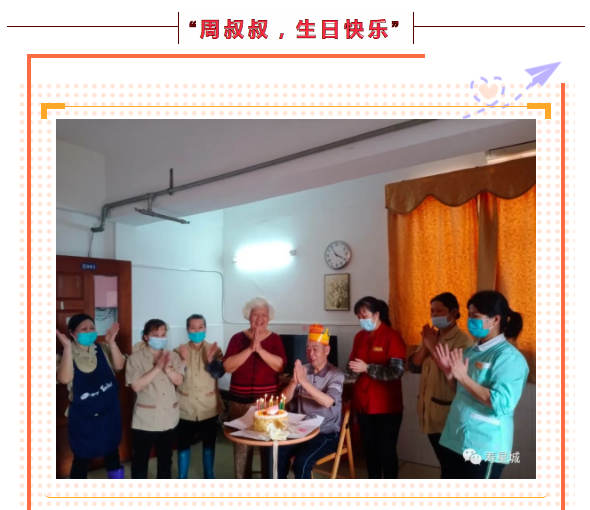 “祝您生日快乐,祝您生日快乐.......”欢快的生日歌从房间传来,3月24日入住寿星城E座的周叔叔迎来了81岁的生日,家属为老人送来了生日祝福和丰盛的生日礼物。疫情期间隔离病毒不隔离爱,为让周叔叔感受寿星城大家庭的温暖,E座邹主管,罗班长及护工们陪伴周叔叔度过了一个简单而特别的“生日”,在这个特别时刻,精致的蛋糕烘托起浓浓的生日氛围,大家纷纷为周叔叔唱生日歌,送上诚挚生日的祝福....